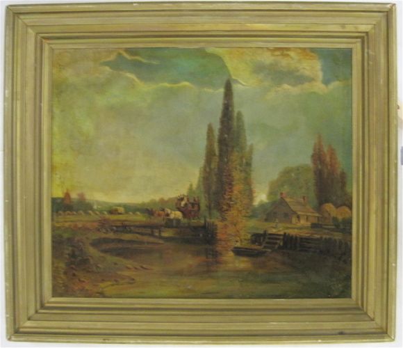 Autumn landscape with log cabin and stagecoach with passengers crossing bridge