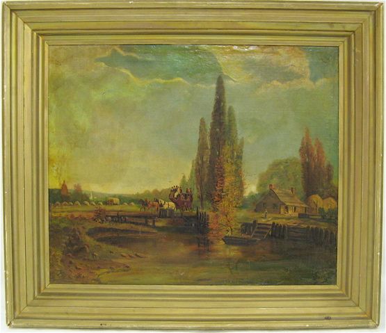 | Autumn landscape with log cabin and stagecoach with passengers crossing bridge | |
