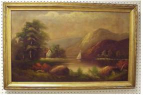 | Landscape, sailboat on a lake, mountains in background with cottage on shore | |