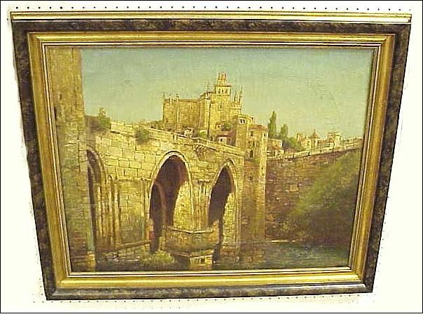 depicts an arched bridge over water with stone castle and buildings in background