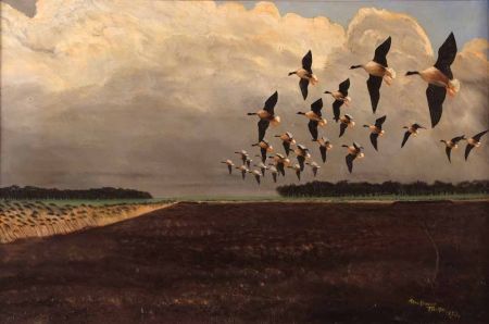 Canada Geese in Flight over a Field