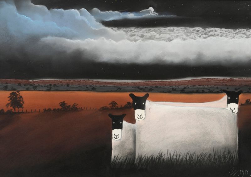Sheep under a Moonlit Sky with a Landscape Beyond