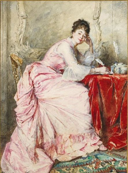 JEUNE FEMME À LA ROBE ROSE ÉCRIVANT