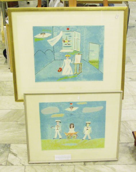 Motiv i naivistisk stil, "kvinnlig konstnär" och "två sjömän med barnvagn"