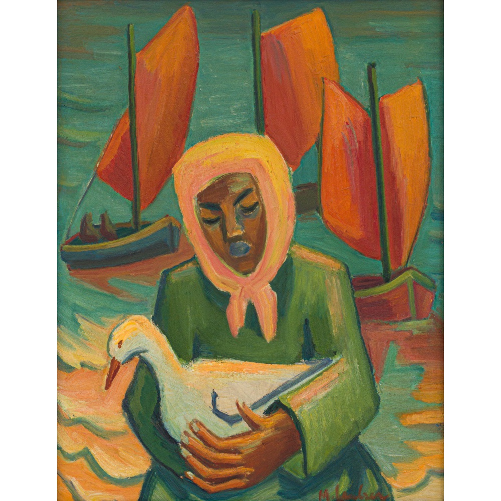| Woman in a Yellow Headscarf with Bird and Boats | |