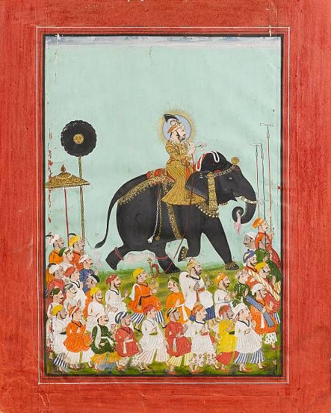 | a young elephant, smoking a hookah, leading a procession of bearers on foot Mewar, circa 1780 | |
