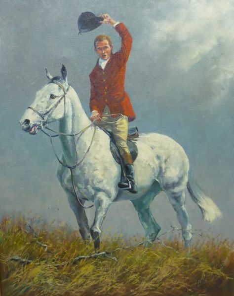 A Huntsman in pinks seated astride his Grey Hunter, waving his cap for the cry