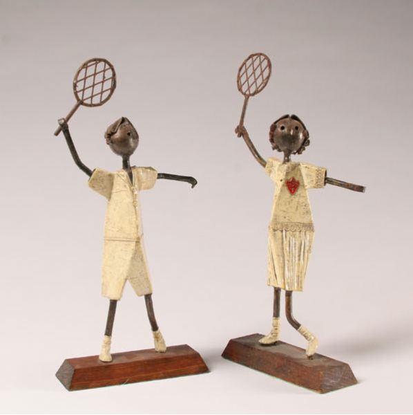 Steel and fabric sculptures on wooden bases