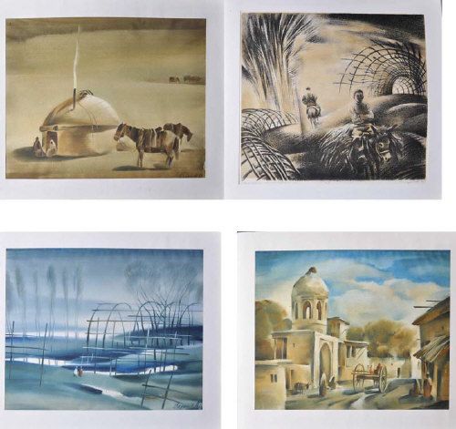FOUR SCENES IN RURAL UZBEKISTAN, INCLUDING HORSES TETHERED OUTSIDE A YURT, A TIGHTROPE ENTERTAINER, AND OTHERS