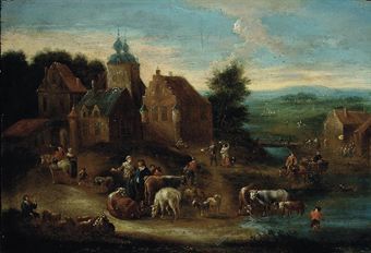 A river landscape with herdsmen and their cattle on a track, a village beyond