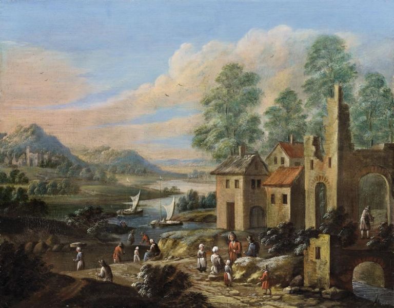 Flusslandschaft mit Ruine und ländlicher Staffage