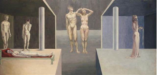 | Représentant à gauche deux hommes dénudés contemplant une femme morte, au centre un couple dénudé, à droite une femme en robe, u | |
