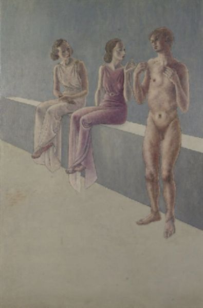 Représentant deux femmes assises regardant un homme dénudé sur leur droite