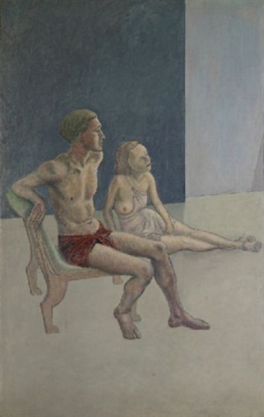 Représentant un couple dénudé, l'homme assis sur une chaise, la femme au sol