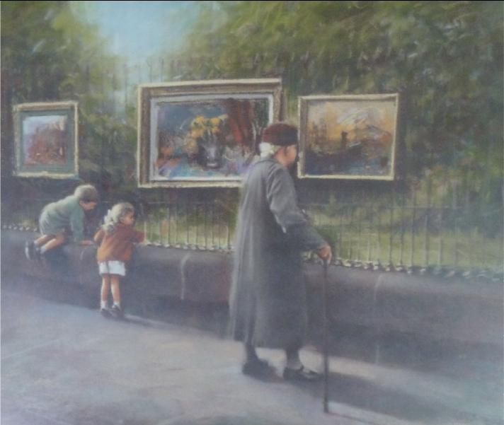Street scene with pictures on railings and figures