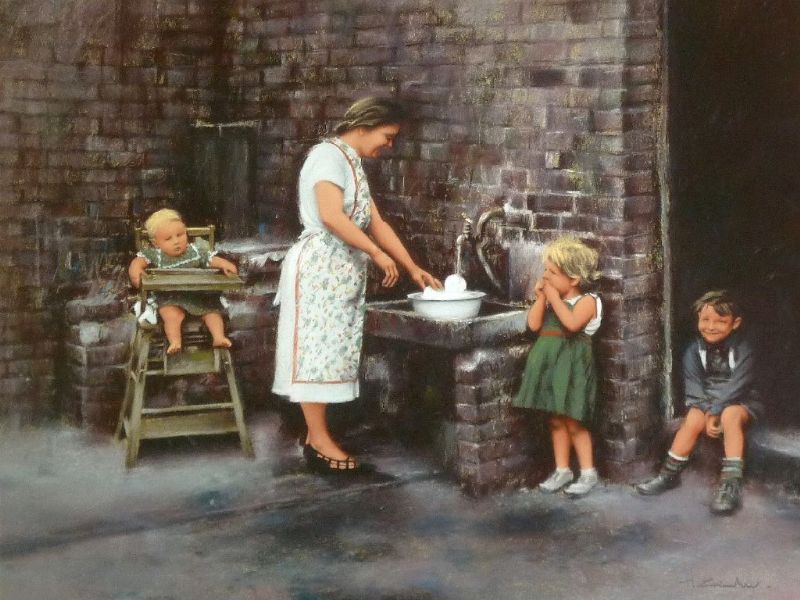 Washing-up, mother and children