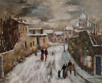MONTMARTRE, RUE ANIMÉE SOUS LA NEIGE