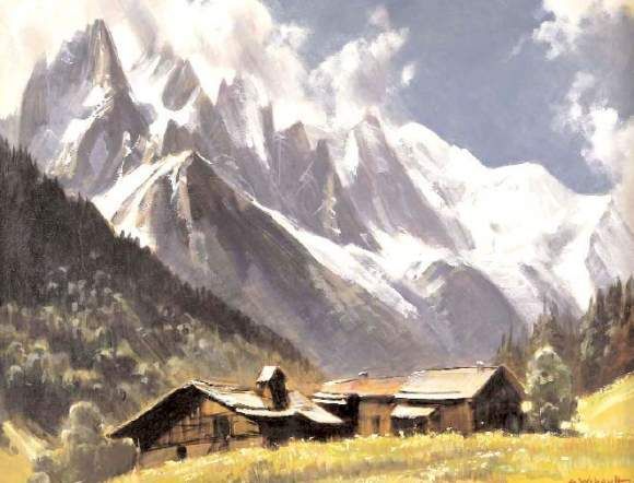 Chalets de la Joux, aiguilles de Chamonix et le Mont-Blanc, circa 1955