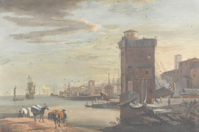 | An Italianate river landscape, with drovers watering their herd; and An Italianate coastal landscape, with travellers by a harbo | |
