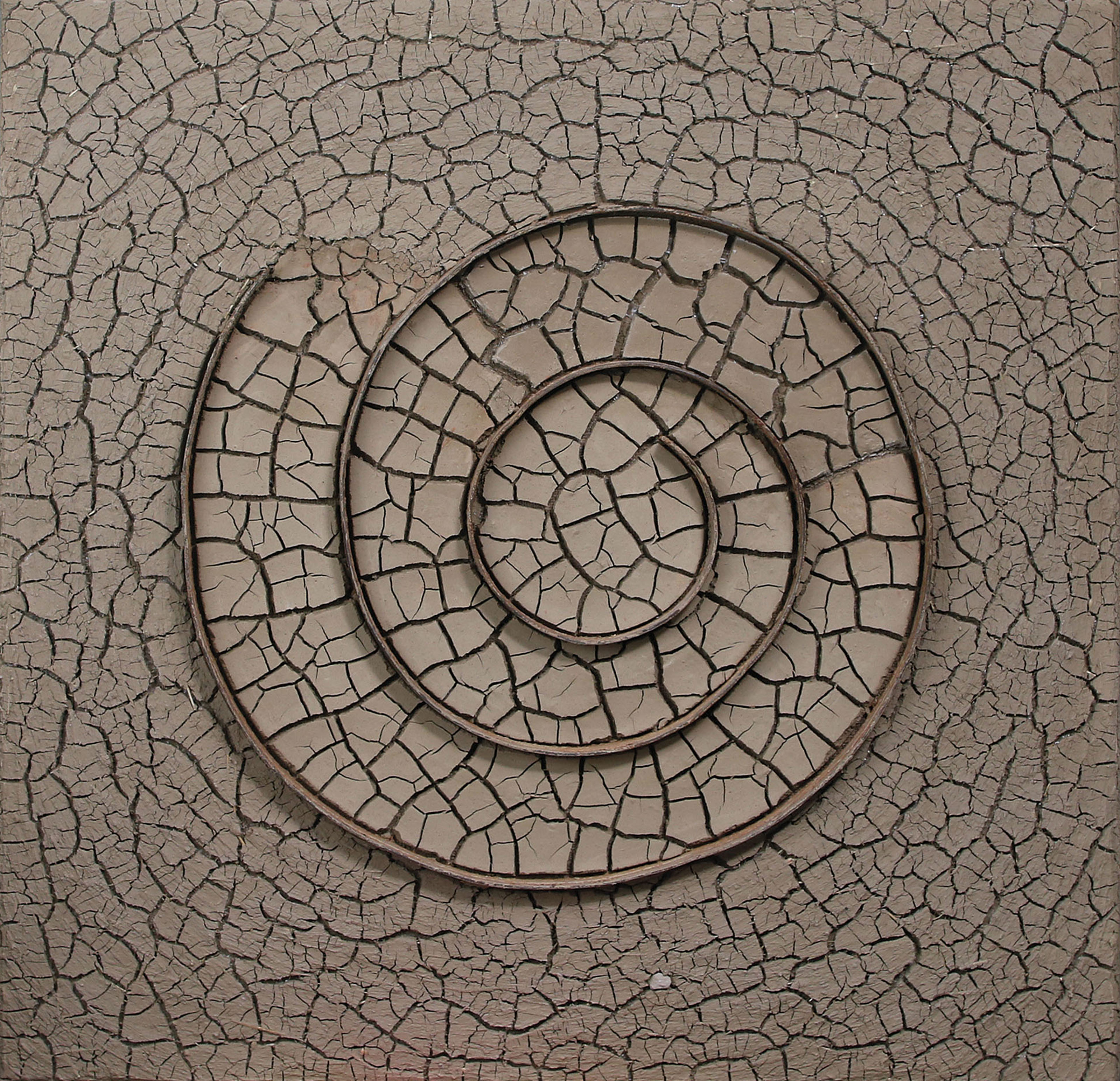 | Metal mud, metal strip, straw and glue on burlap laid down on board | |