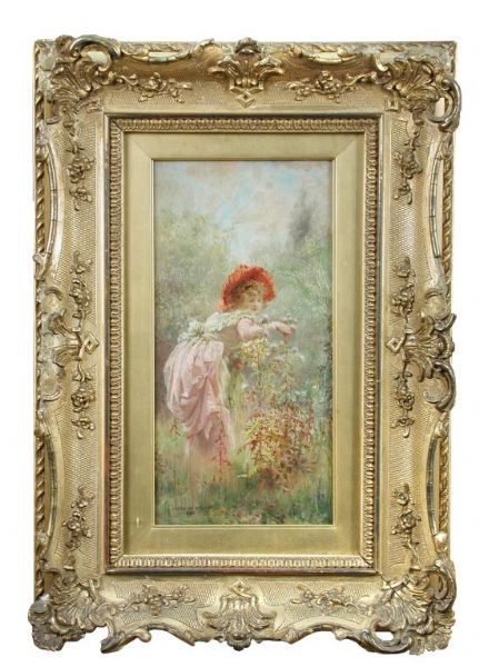 | A young girl in a red mob cap and pink-bustled dress, picking wildflowers | |