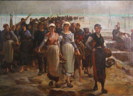 procession of oyster gatherers coming to shore, sailing boats in the background