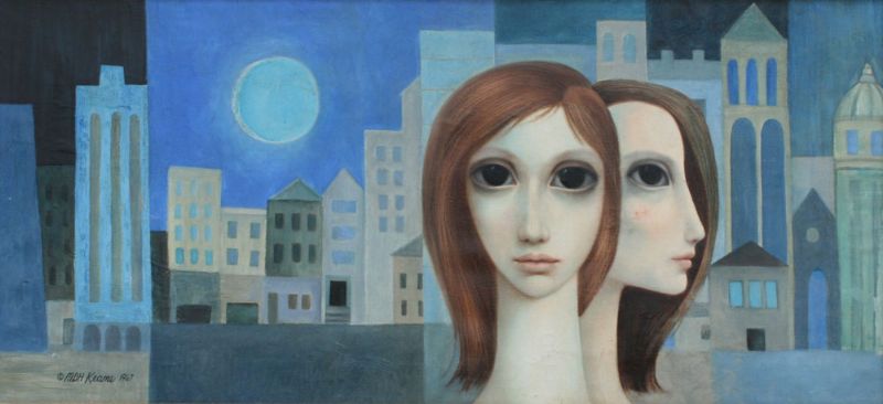 Two Young Large Eyed Girls in a Moonlit Cityscape