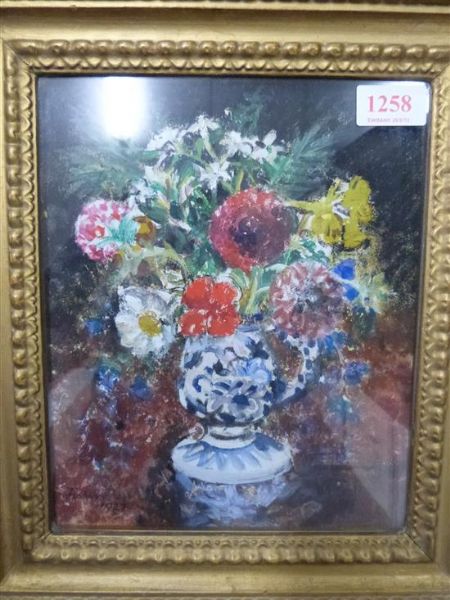 still life of flowers in blue and white vase