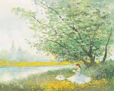 A WOMAN AND CHILD BY A PEACEFUL RIVER