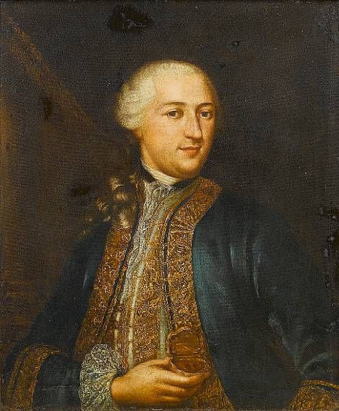 | Portrait of a gentleman, half-length, in a blue, brocade edged coat holding a gold box and standing before a curtain | |