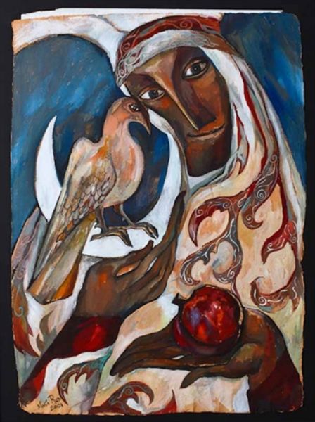 Figure holding a bird and fruit