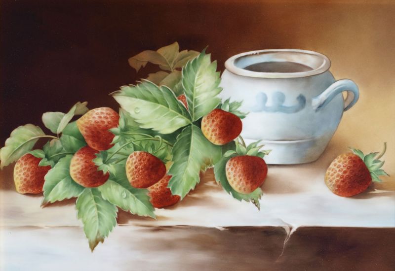 Still Life of Fresh Strawberries and a Jug on a stone wall