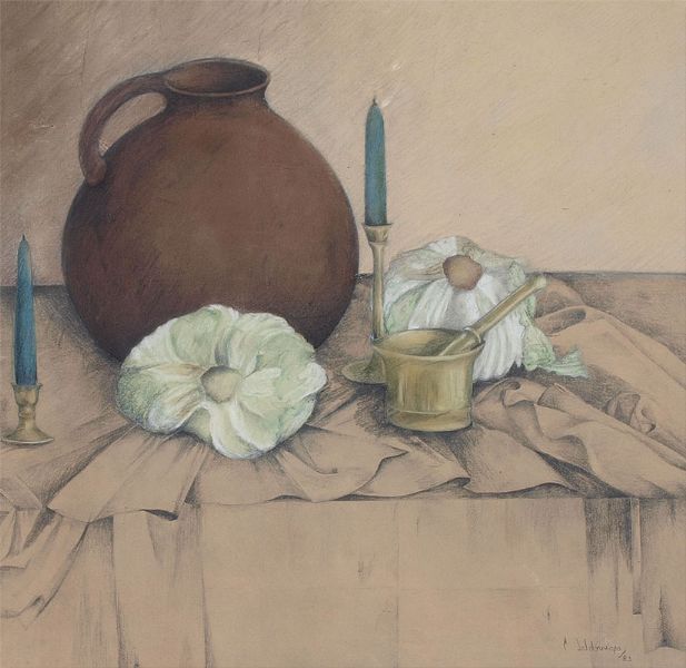 Still Life with Handled Jug, Candles, and Mortar and Pestle