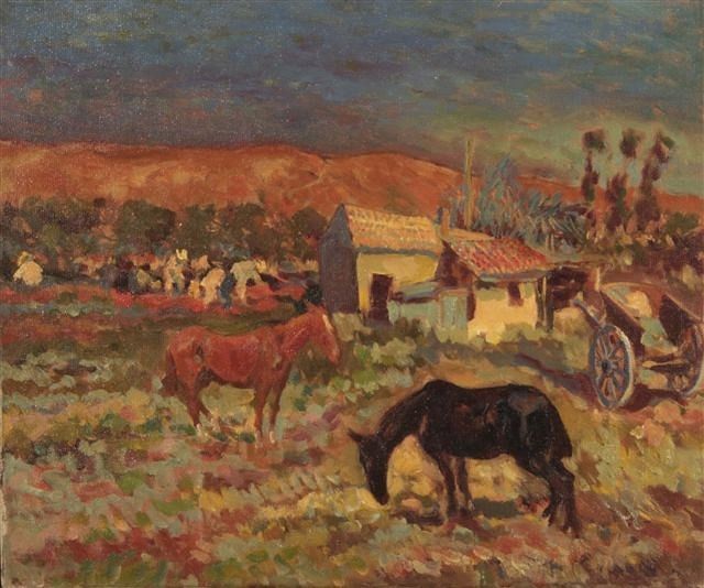 Men working and two horses grazing on a farm outside Toledo, Spain
