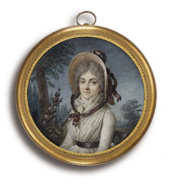 | Comtesse de Genlis (1746-1831), seated on a wooden chair, in white dress with brown sash, white scarf tied in a bow at neck, gol | |