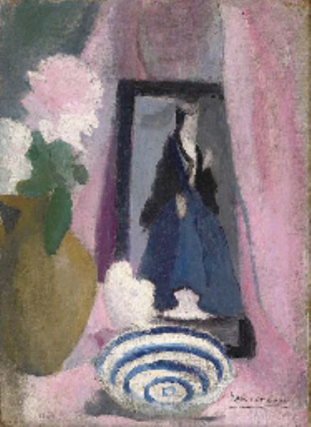 Nature morte sur une table: bouquet, coupe et petit portrait