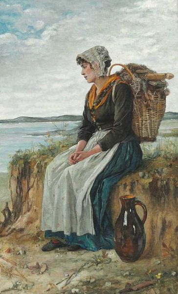 | A fisherman's daughter resting near the sea with a heavy basket on her back | |