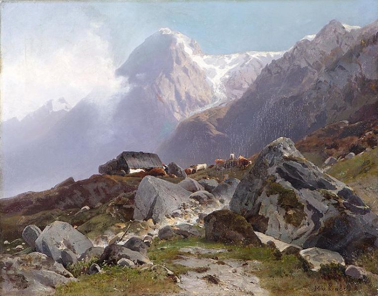 Auf der großen Scheideck, Berner Oberland. Alm mit Hütten und Kuhherde