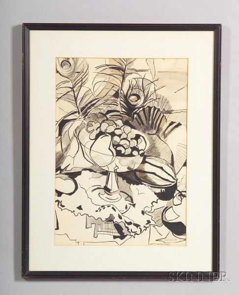 Abstract Bowl of Fruit and Peacock Feathers
