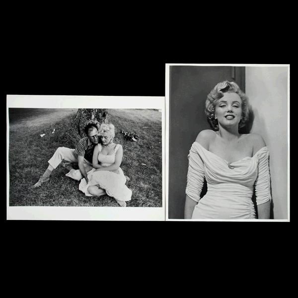 Two black and white photographs featuring Marilyn Monroe, one with husband Arthur Miller.