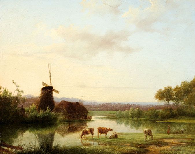 | River landscape with a shepherdess with her cows and to the left a mill by a farm | |