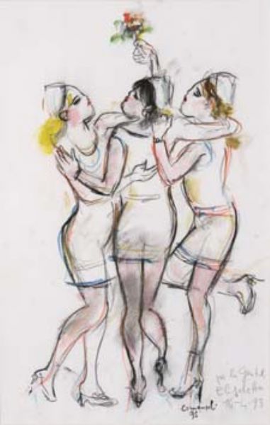 | Drei beschwingte, hübsche, sich umarmende Krankenschwestern in knappen, weissen Habits,eine hält kleines Bouquet hoch in die Luf | |