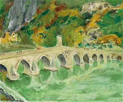 Flusslandschaft mit Bogenbrücke, signiert Mikulic