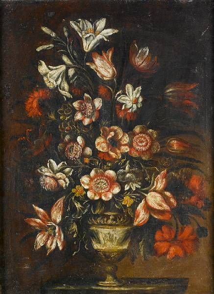 Narcissi, lilies, tulips and other flowers in a classical urn on a plinth