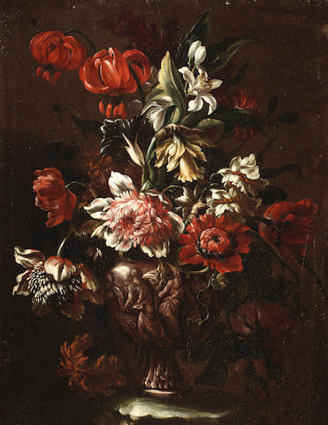 Tulips, convolvulus, lilies and other flowers in a terracotta vase