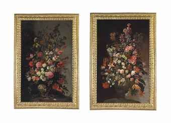 | Tulips, lilies, irises and other flowers, in a sculpted urn, with a snake and a moth, on an earthen bank; and Roses, tulips, chr | |
