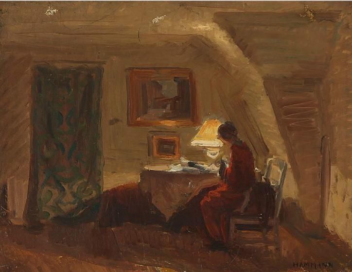 A woman reading by the lamplight