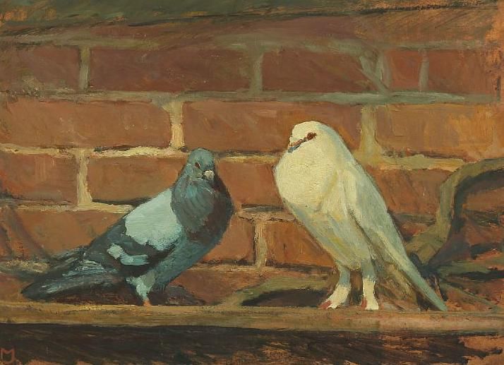 Two pigeons by a wall