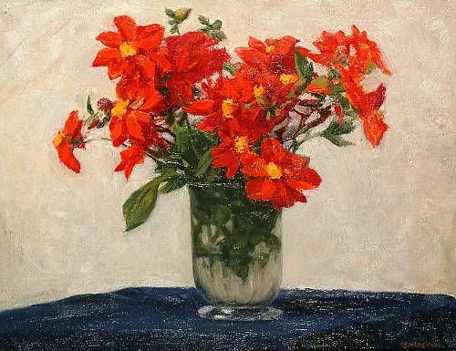 Crimson dahlias on a blue ground.