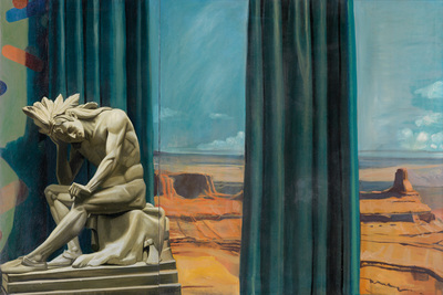 Western Panorama with Sculpture of Native American Warrior.